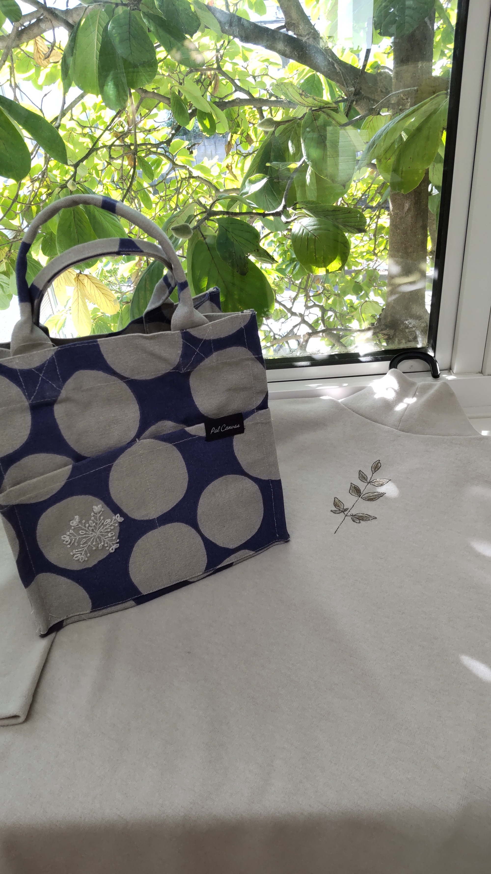 講習会のお知らせ やっと秋。冬の日はいつ訪れるのかわかりませんが、今月の講習会は、ひと足もふた足も早く暖か素材のチュニックに秋の色の木の葉を並べてみました。2021年11月の無料講習会のデザインの内の1つです。チュニックはベージュとチャコール、サイズはⅯ、L、LLです。ベージュ地には秋の色を、チャコールにはモノトーンに少し変化をつけてご用意しました。そしてもう1点。外と内にポケットが付いた使い勝手の良さそうなミニトート。藤がかったグレー地にグレーの大きな丸がデザインされた地の表のポケットにワンポイント、オフホワイトでスノーフレークを刺しゅうします。2019年12月講習のブローチの柄です。