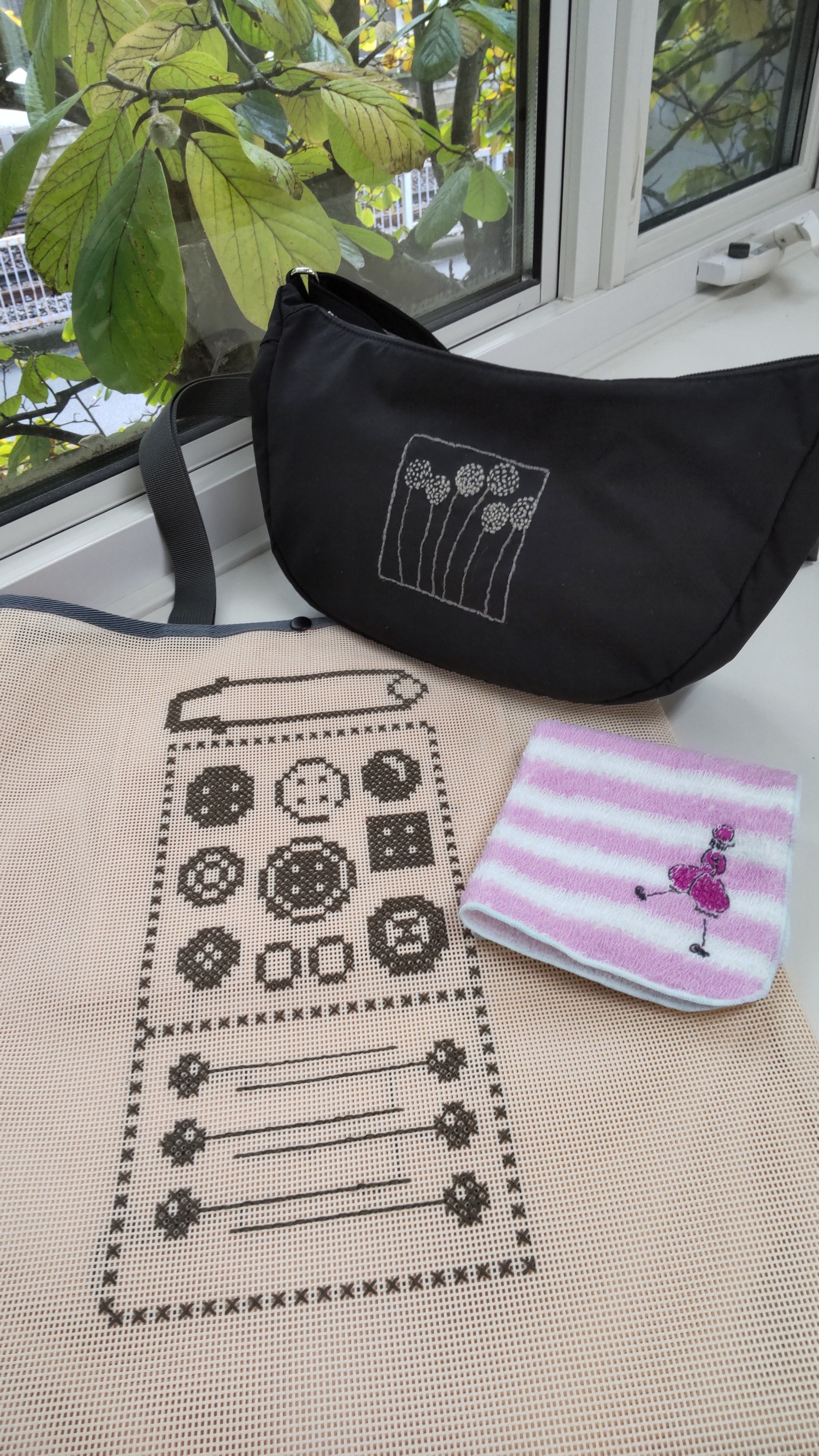 ほんの少しづつ秋が近づいて来ましたね。外に出る機会も増えてくるのではないですか?そんな時、こんなサブバックはいかがでしょうか。コットンプリント地に刺しゅうを細くはめ込んで43㎝×39㎝の大きめの手提げに仕上げます。裏地も付けず、軽くエコバックのように使って頂きたいと思います。柄は2011年講習の花のベルプルを秋色にアレンジ。秋の入口にぴったりの1点になったのではないでしょうか。(ご希望の方には2011年講習の巾着も併せて講習します)