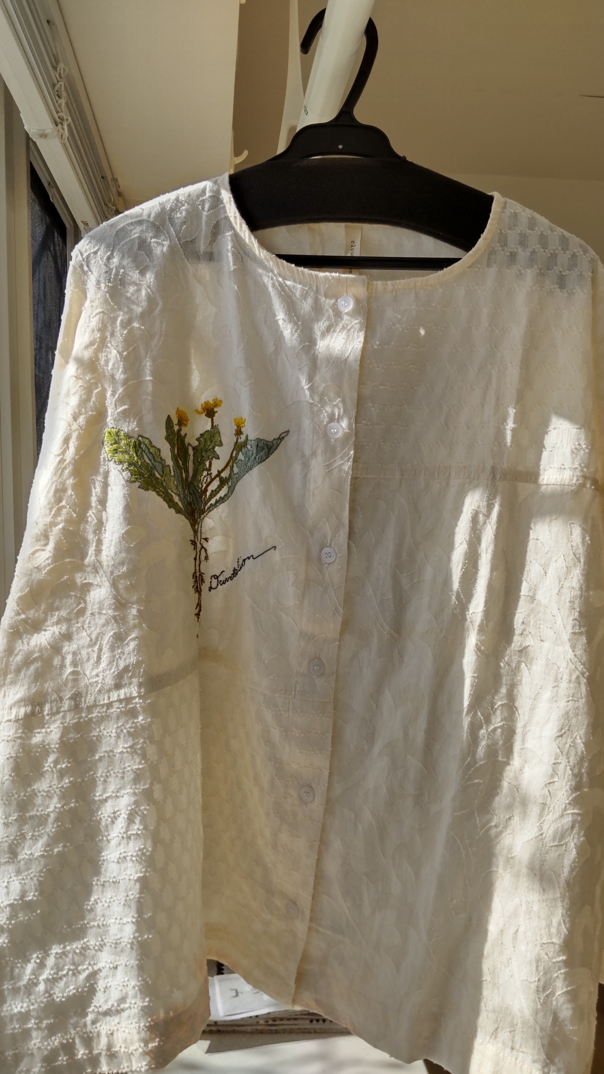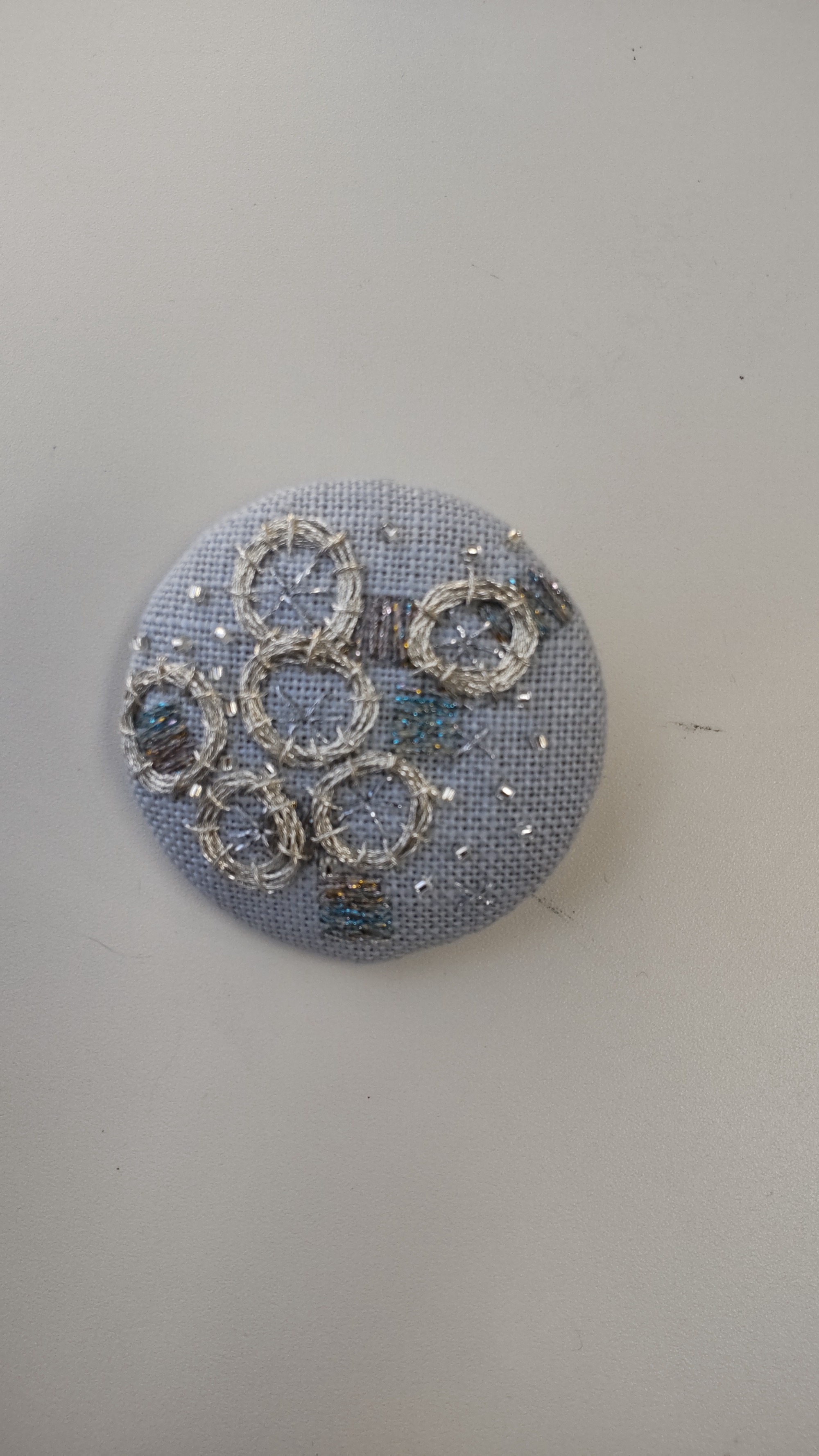 お正月の雪景色にちょっと驚きましたが、穏やかな1月。最強寒波の予報もありますが、今年もアトリエKAZUEの講習会、どうぞよろしくお願いいたします。さて、1月はいつもどうりブローチです。シンプルな5㎝φの丸型。シルバーグレーにラメとビーズで明るい表情のものと、茶がかったグレー地にスモーキーなマルチカラーの糸でフレンチナッツを散らしたレースフラワー柄の2種。そしてもうひとつ、ほんの少しですが、オフホワイトのコットンシャツの胸に「ハーブの刺しゅう」からダンデライオン(タンポポ)を刺しゅうしてみました。ノーカラーとシャツカラー、9枚と7枚の16枚のみ。ご希望が多ければ3月の無料講習会までに素材、探してみます。
