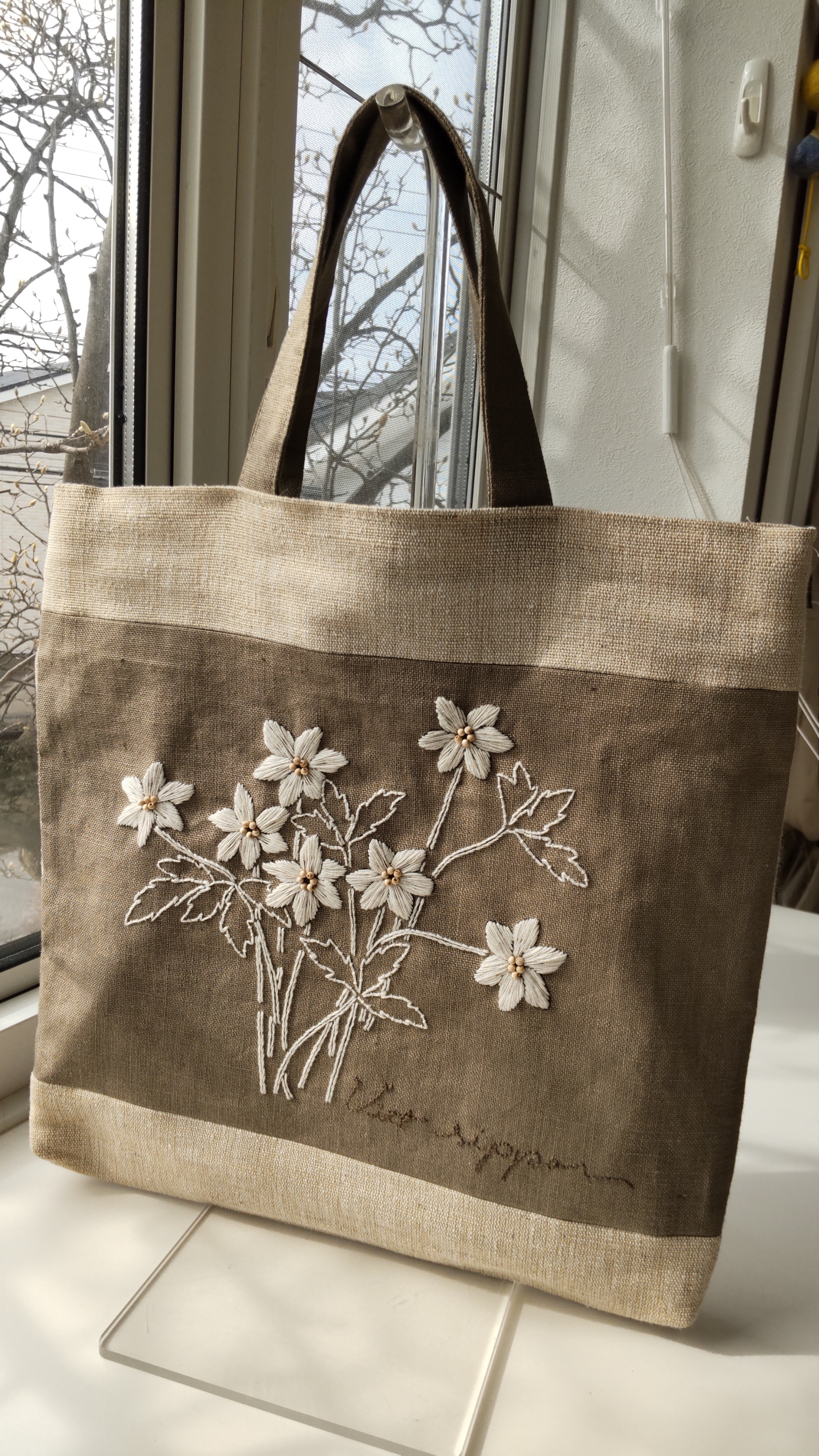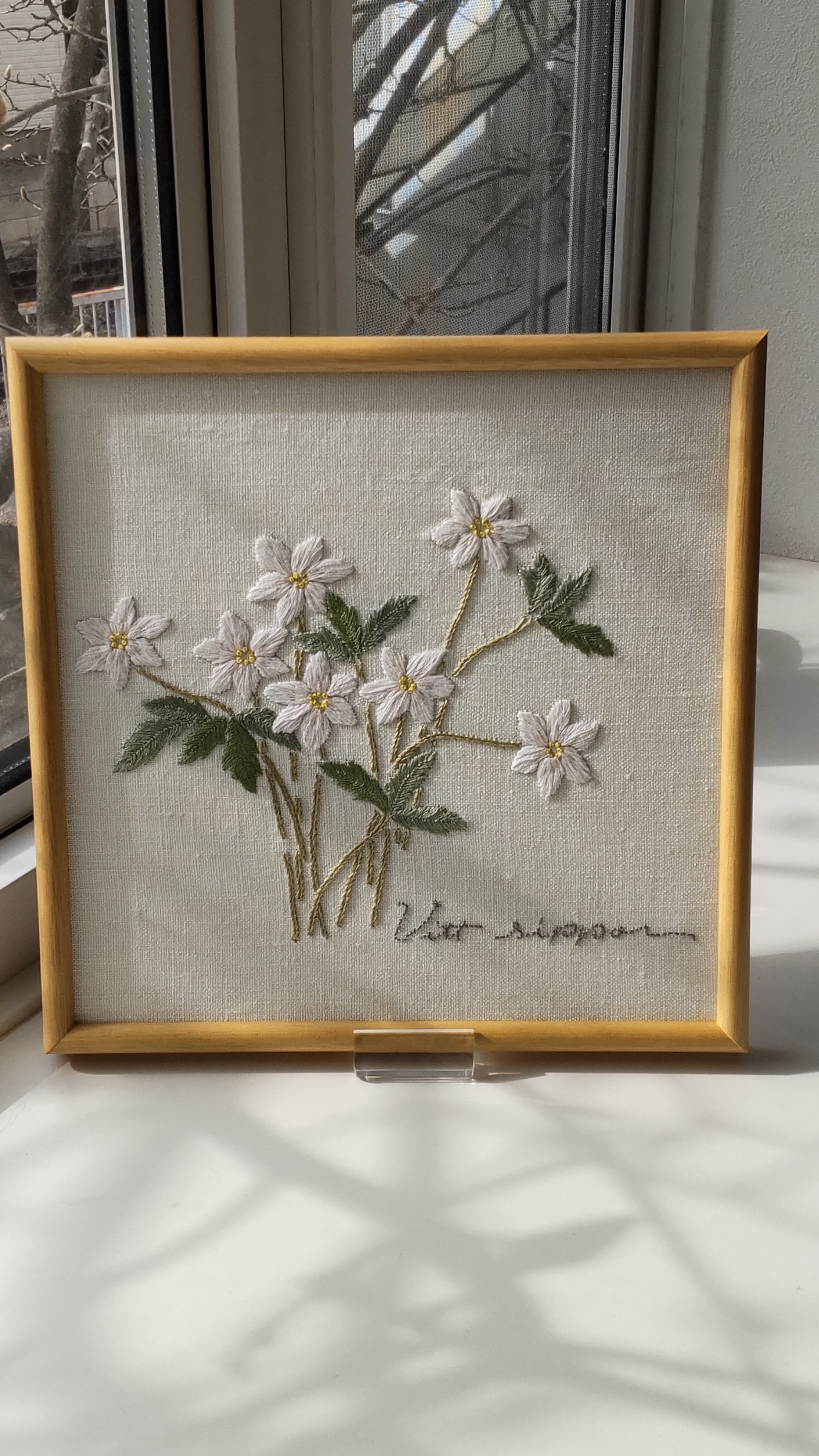 春が待ち遠しい2月に、スウェーデンに春を告げる 花、雪割草はいかがでしょか。白い雪割草を淡いピンクとやわらかいグリーンでやさしい額に仕上げました。25㎝角の木地のフレームに入れてどこに飾ってもしっくりなじむ作品になったと思います。そして、同じモチーフを濃い砂色の地にオフホワイトの一色刺しで手提げを作ります。明るい生成りのしっかりした麻布と合わせて、35㎝角位の中位の大きさの手提げです。木蓮の蕾もふくらんで来ました。