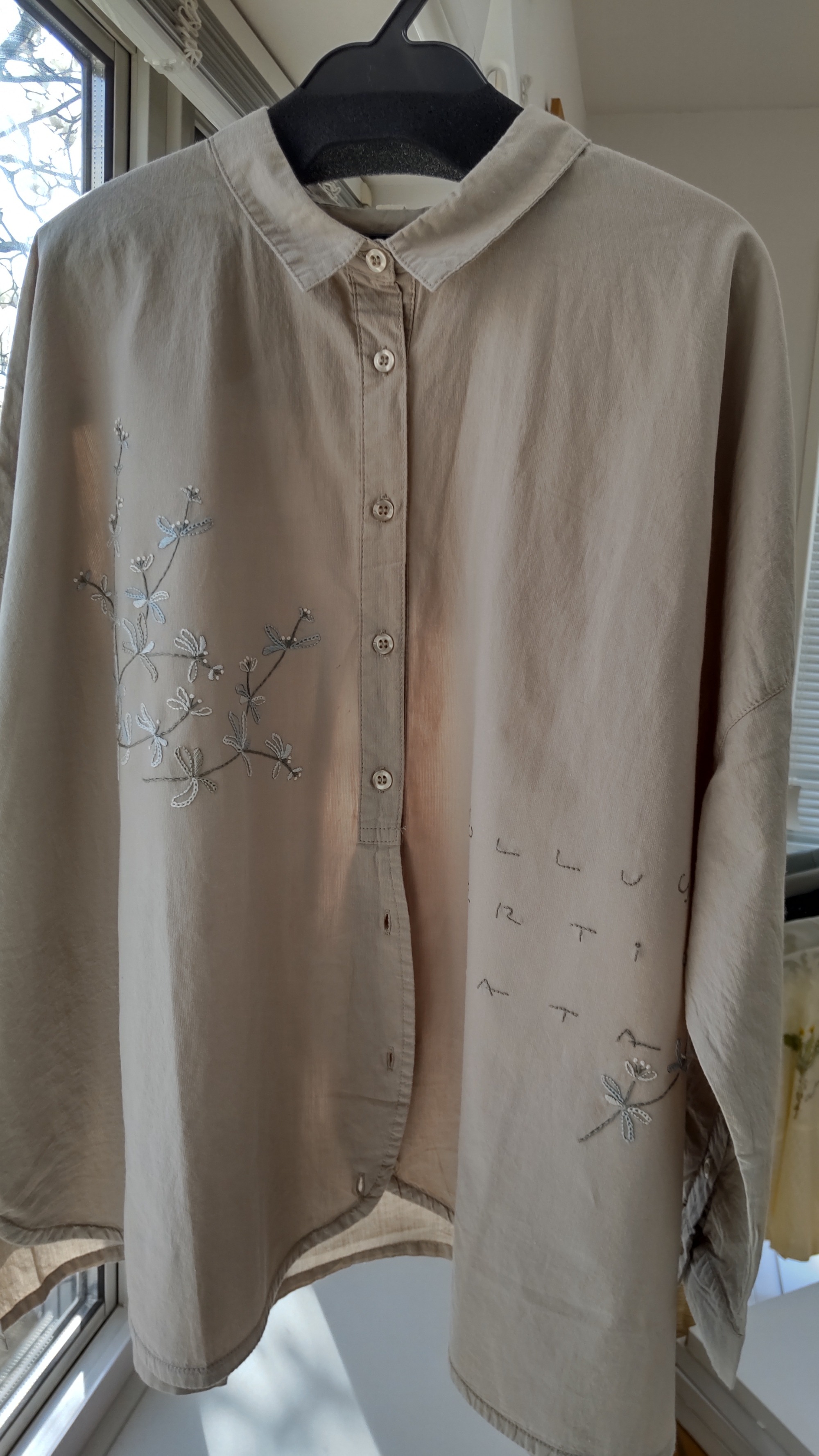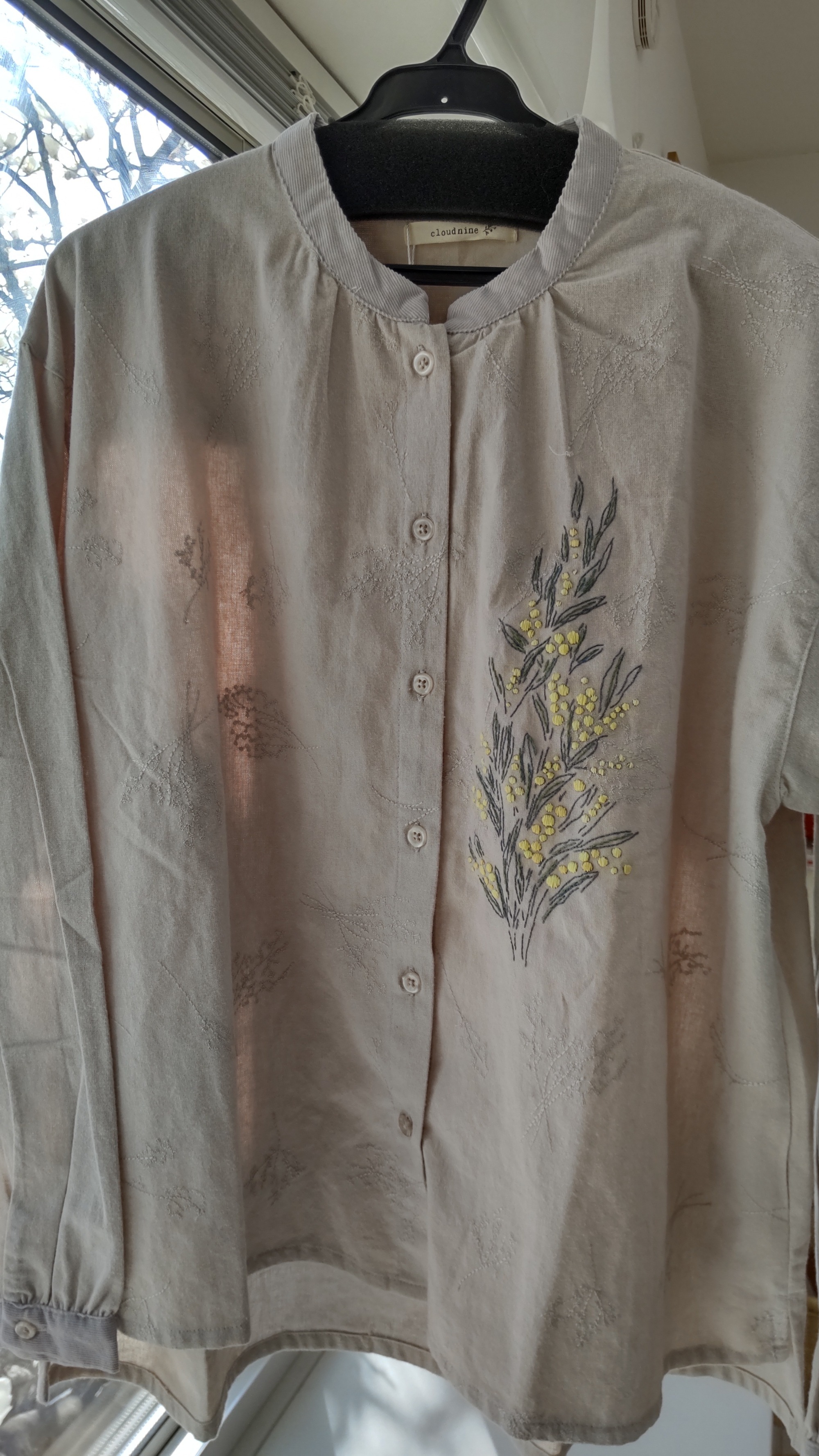 ブラウスは白地で小さなシャツカラー、前開きにそって可憐な花を並べます。サイズはフリーとLL。他にも手持ちのブラウス数種(価格も色々です)からお選び頂けます。着るものはあまり…という方に春の花を集めた額もご用意しました。春待つ刺しゅう是非お楽しみ下さい。